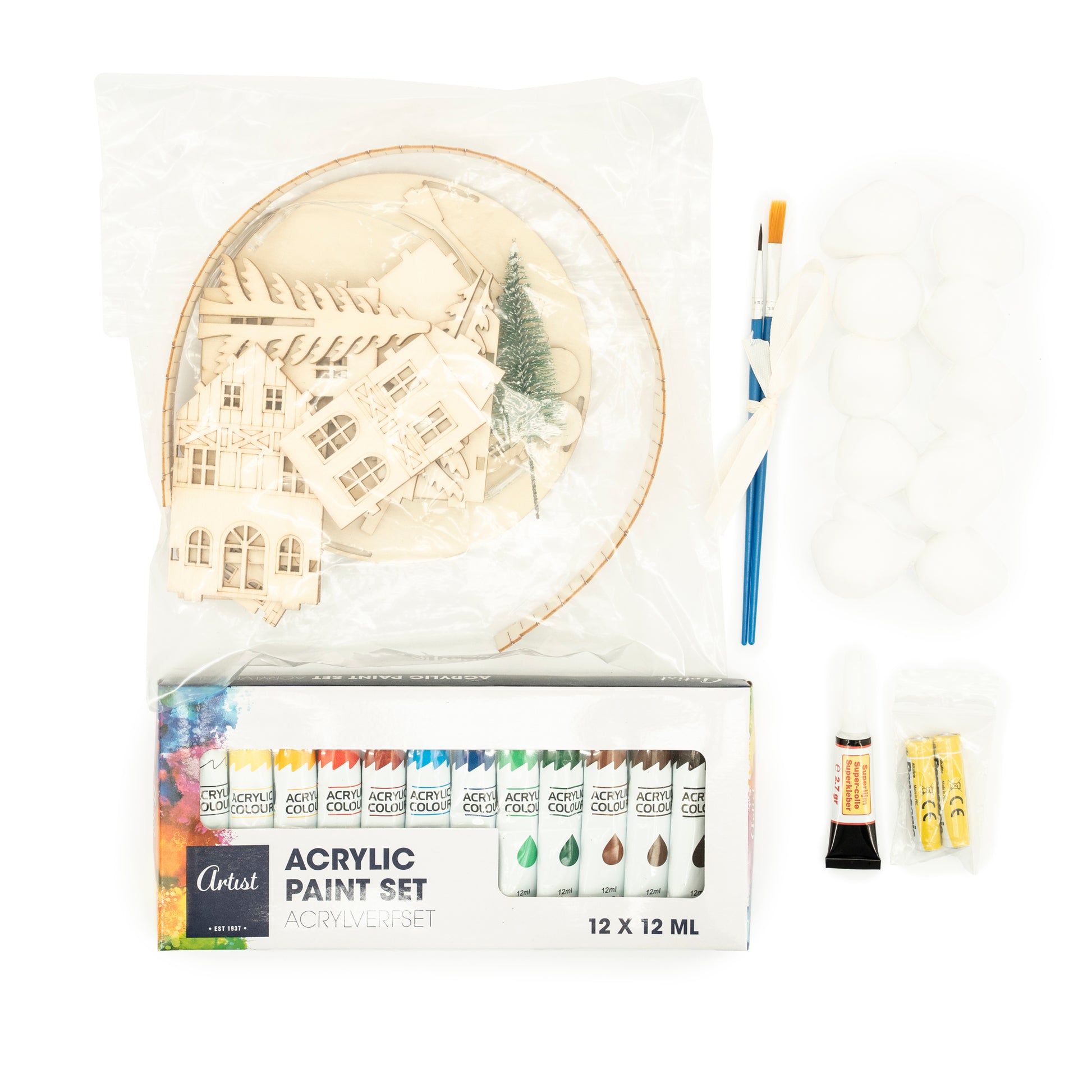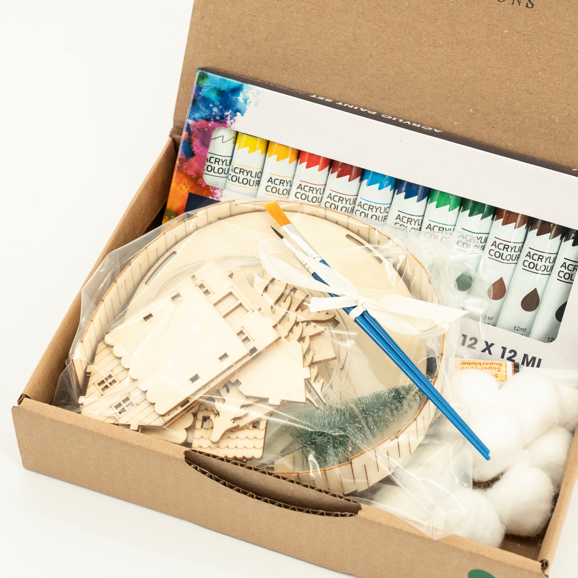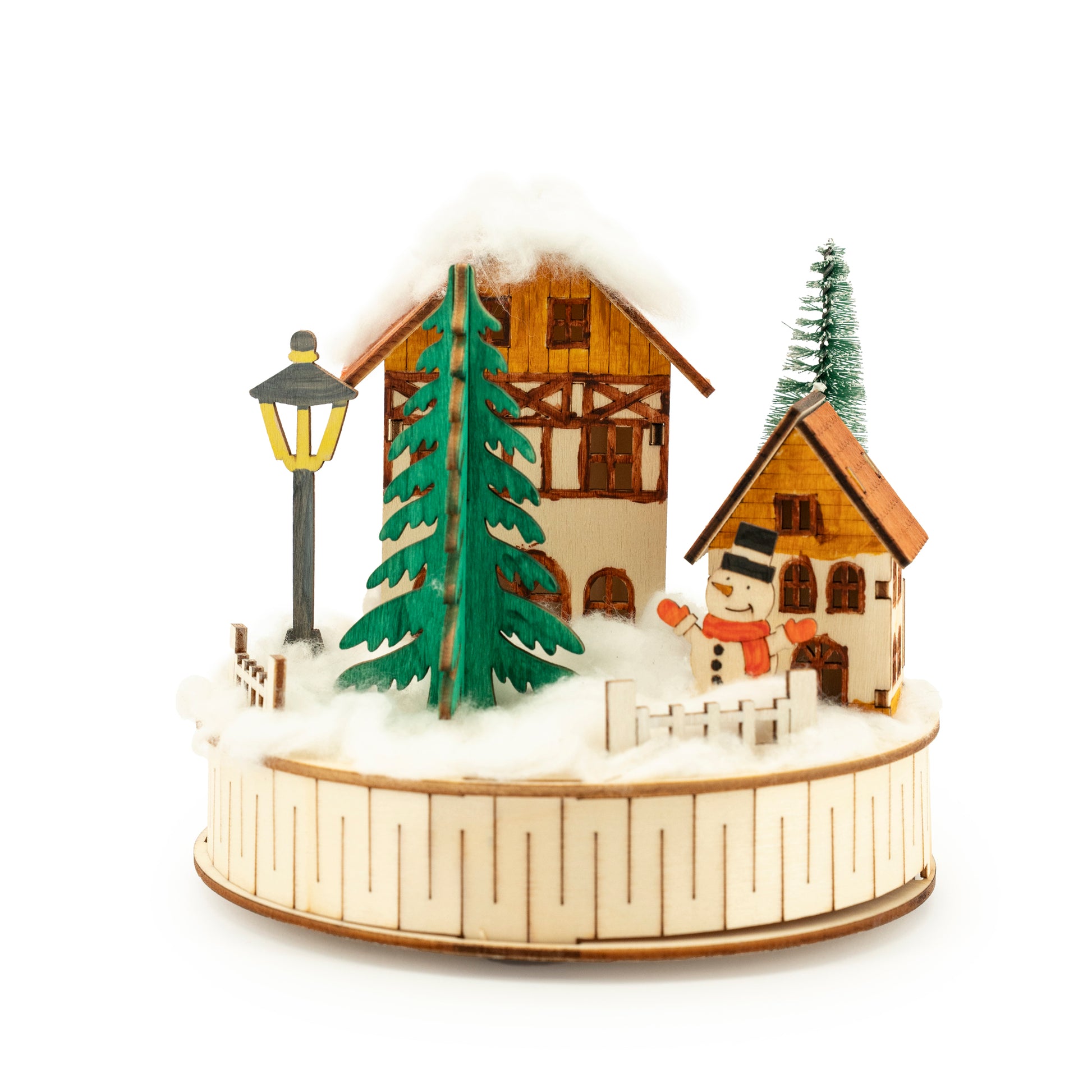 Verf, bouw en voeg verlichting toe voor een warme, winterse sfeer. De sneeuwpop, kerstboom en watten-sneeuweffect maken jouw decoratie compleet. Ideaal voor knutselaars en een origineel cadeau voor de feestdagen!